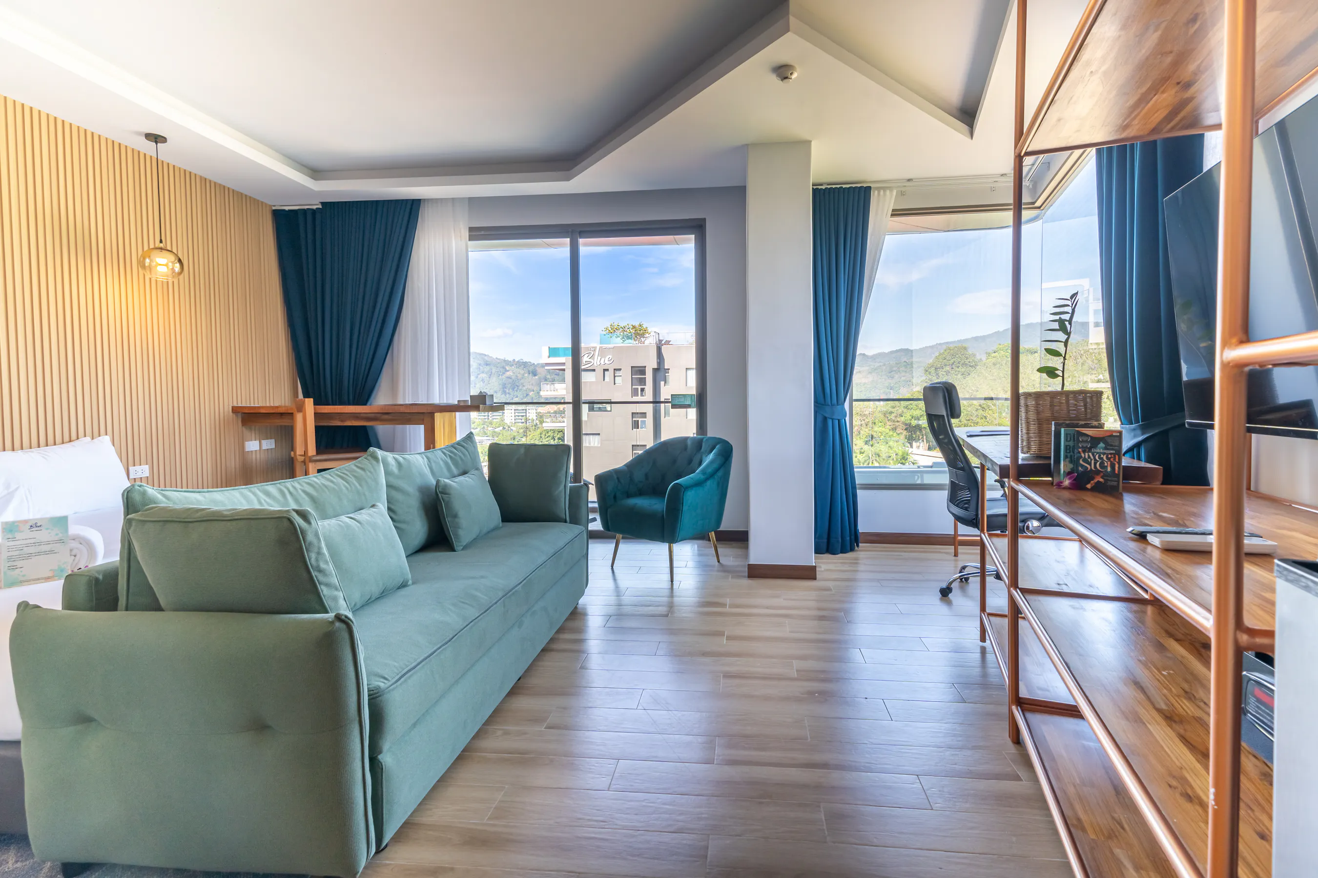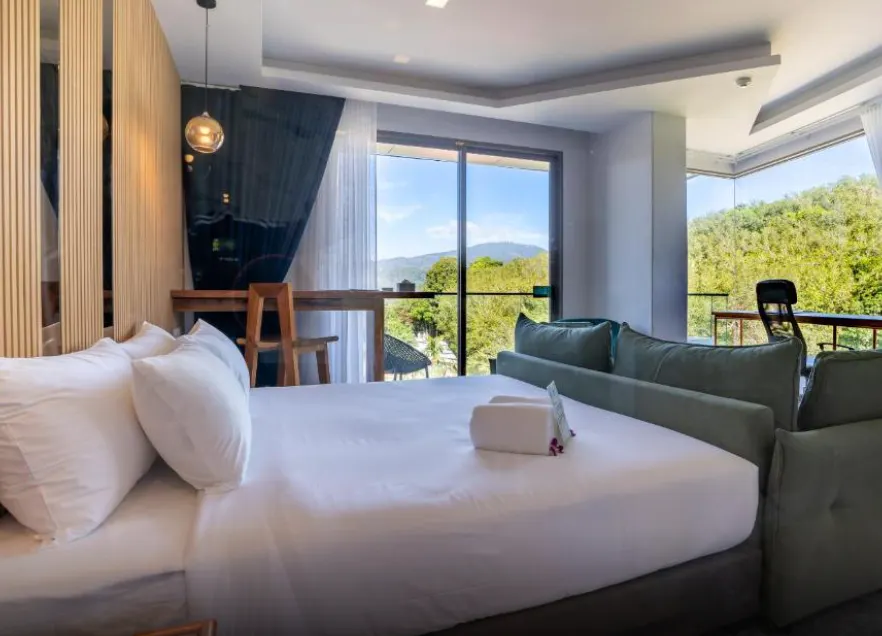 A cozy studio featuring a comfortable double bed, a large sofa, and a work desk by the window. Enjoy a relaxing soak in the bathtub on the balcony.